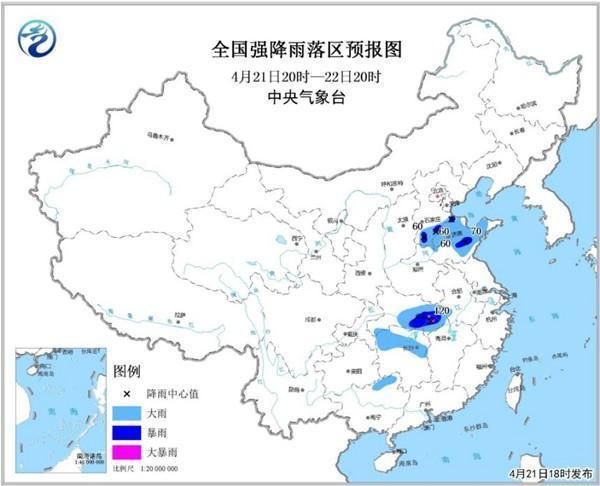 預(yù)計4月21日20時至22日20時,河北南部、山東中北部、湖北中東部、湖南北部、廣西北部等地的部分地區(qū)有大雨或暴雨,局地有大暴雨(100~120毫米),上述局地并將伴有短時強降水、雷暴大風或冰雹等強對流天氣。