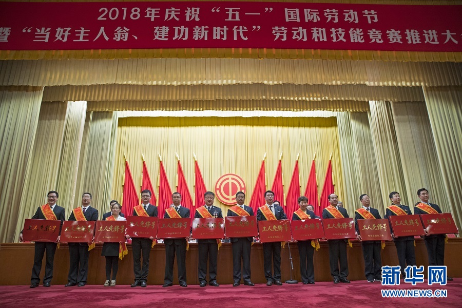 4月28日,榮獲全國工人先鋒號的部分集體代表在大會上合影。當(dāng)日,2018年慶?!拔逡弧眹H勞動節(jié)暨“當(dāng)好主人翁、建功新時代”勞動和技能競賽推進(jìn)大會在北京人民大會堂舉行。 新華社記者 才揚 攝
