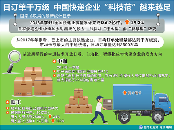 圖表:日訂單千萬(wàn)級(jí) 中國(guó)快遞企業(yè)“科技范”越來(lái)越足 新華社記者 肖瀟 編制