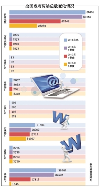 通報顯示,截至2018年3月1日,全國正在運(yùn)行的政府網(wǎng)站23269家,其中,國務(wù)院部門及其內(nèi)設(shè)、垂直管理機(jī)構(gòu)政府網(wǎng)站1872家,省級政府門戶網(wǎng)站32家,省級政府部門網(wǎng)站2349家,市級政府門戶網(wǎng)站523家,市級政府部門網(wǎng)站14097家,縣級政府門戶網(wǎng)站2750家,縣級以下政府網(wǎng)站1645家。