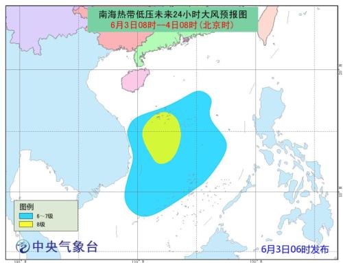 中央氣象臺(tái)3日06時(shí)繼續(xù)發(fā)布熱帶低壓預(yù)報(bào):南海熱帶低壓的中心今天5點(diǎn)鐘位于我國西沙永興島偏南方大約410公里的南海南部海面上(北緯13.2度、東經(jīng)111.9度),中心附近最大風(fēng)力有7級(jí)(15米/秒),中心最低氣壓為1002百帕。