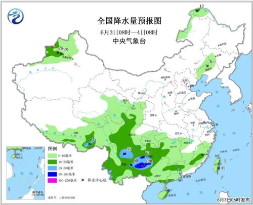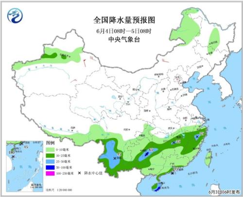 6月3日08時(shí)至4日08時(shí),新疆中北部、青藏高原中東部、甘肅南部、西南地區(qū)大部、江南中南部、華南大部等地有小到中雨,西南地區(qū)東部和南部、華南北部和中部等地的局地有大雨或暴雨(100~120毫米),上述局部地區(qū)將伴有短時(shí)強(qiáng)降水等強(qiáng)對(duì)流天氣。新疆北部、內(nèi)蒙古東部、華北西部等地的部分地區(qū)有4~6級(jí)風(fēng),其中北疆山口地區(qū)陣風(fēng)可達(dá)9~10級(jí)。南海中南部等地將有6-8級(jí)大風(fēng),陣風(fēng)9級(jí)。