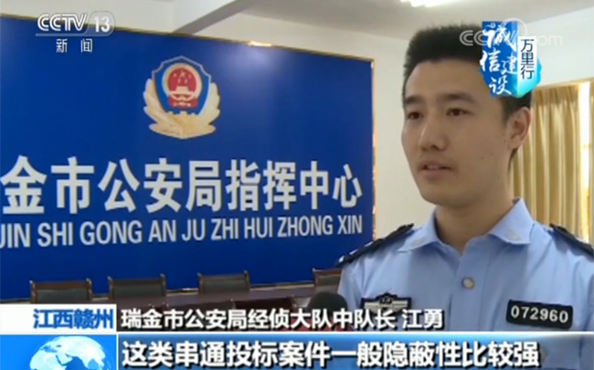 瑞金市公安局經(jīng)偵大隊中隊長 江勇:這類串通投標案件一般隱蔽性比較強,對于這個案子來說,涉案人員眾多。而且他們都是利益獲得方容易形成攻守同盟,對我們公安機關取證有很大的困難。通過調(diào)取大量的銀行流水和該項目的相關投標招標資料。再通過外圍走訪,確定鐘某等人涉嫌串通投標。