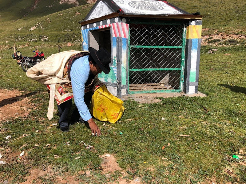 每天早晨9時,雜多縣扎青鄉(xiāng)牧民扎次尼瑪把自家牦牛趕出牛圈來到草場后,就開始了一天巡山的工作。除了對管護區(qū)內草原基礎設施進行監(jiān)管、舉報盜采盜獵行為、監(jiān)測草原火情災情以外,“分揀垃圾”也是扎次尼瑪作為“生態(tài)管護員”的工作日常。