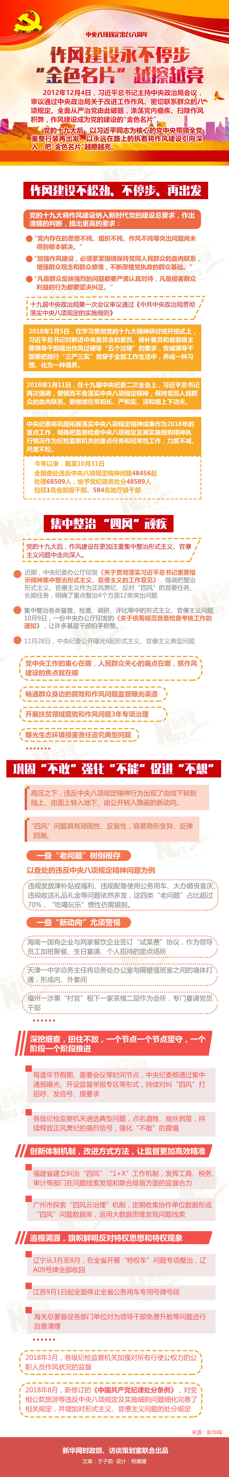 黨的十九大后,以習(xí)近平同志為核心的黨中央以明確的態(tài)度、堅(jiān)定的意志和扎實(shí)的行動(dòng),再次向全黨釋放出抓八項(xiàng)規(guī)定精神落實(shí)、推進(jìn)作風(fēng)建設(shè)不松勁、不停步、再出發(fā)的強(qiáng)烈信號(hào)。
