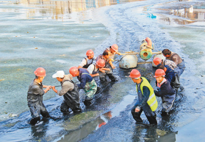 工人在后湖清淤。吳 鷗攝