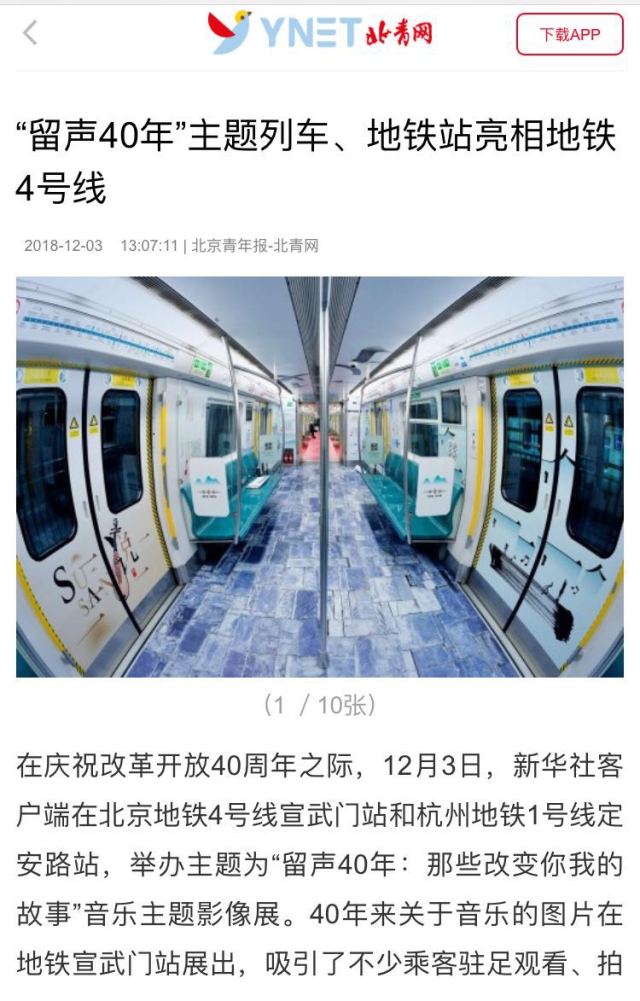 新華社北京12月4日電(記者 牧小湘)為慶祝改革開放40周年,新華社客戶端與網(wǎng)易云音樂、京港地鐵聯(lián)合舉辦的“留聲40年:那些改變你我的故事”音樂主題影像展12月3日亮相北京地鐵4號線宣武門站及杭州地鐵1號線定安路站。