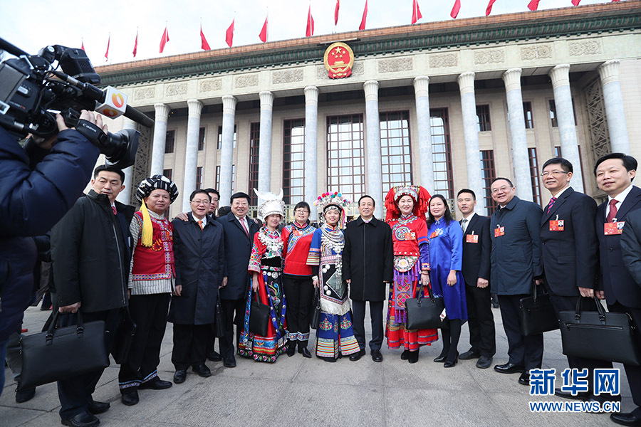 3月5日,第十三屆全國(guó)人民代表大會(huì)第一次會(huì)議在北京人民大會(huì)堂開(kāi)幕。這是代表們?cè)谌嗣翊髸?huì)堂前合影。 新華網(wǎng)/中國(guó)政府網(wǎng) 翟子赫攝