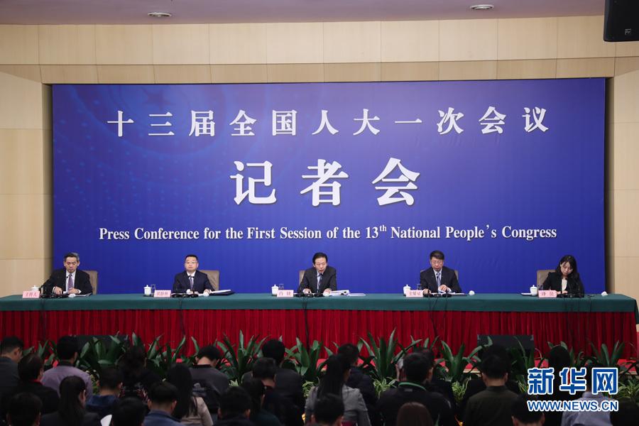 十三屆全國人大一次會(huì)議新聞中心于3月7日上午在梅地亞中心多功能廳舉行記者會(huì),邀請(qǐng)財(cái)政部部長肖捷,副部長史耀斌、胡靜林就“財(cái)稅改革和財(cái)政工作”相關(guān)問題回答中外記者提問。圖為肖捷(中)回答記者提問。新華網(wǎng)/中國政府網(wǎng) 翟子赫 攝