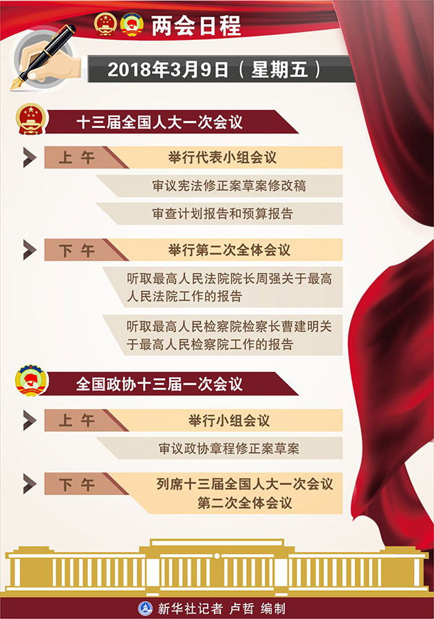 新華社北京3月8日電? 十三屆全國人大一次會議9日上午舉行代表小組會議,審議憲法修正案草案修改稿,審查計劃報告和預(yù)算報告。下午3時在人民大會堂舉行第二次全體會議,聽取最高人民法院院長周強關(guān)于最高人民法院工作的報告,聽取最高人民檢察院檢察長曹建明關(guān)于最高人民檢察院工作的報告。