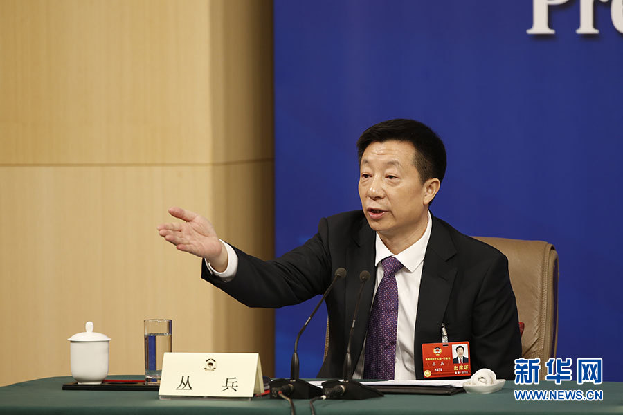 3月10日8時(shí)45分,全國(guó)政協(xié)十三屆一次會(huì)議在梅地亞中心多功能廳舉行記者會(huì),邀請(qǐng)5位全國(guó)政協(xié)委員就“提高保障和改善民生水平”回答記者提問。圖為記者會(huì)主持人叢兵。新華網(wǎng)/中國(guó)政府網(wǎng) 翟子赫 攝