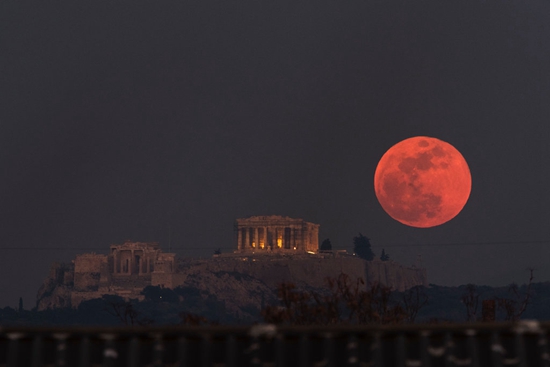 2018年1月31日,超級藍(lán)血月亮照耀在雅典神廟上