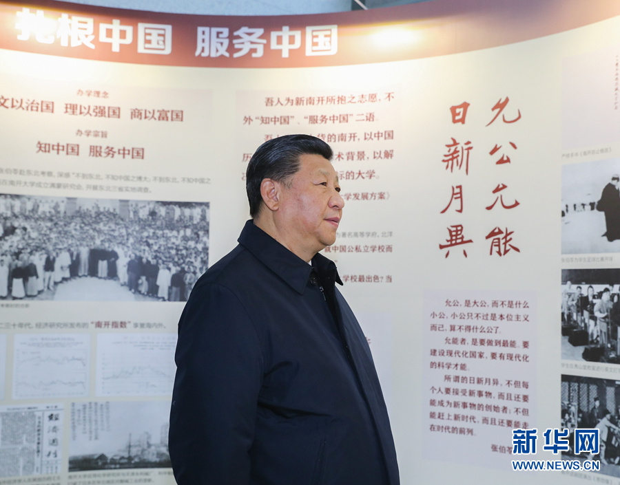 17日上午,習(xí)近平來到天津南開大學(xué)考察調(diào)研。南開大學(xué)成立于1919年,是一所具有光榮愛國傳統(tǒng)的名校。習(xí)近平參觀了校史展覽,詳細(xì)了解南開大學(xué)歷史沿革、學(xué)科建設(shè)、人才隊(duì)伍、科研創(chuàng)新等情況。習(xí)近平指出,學(xué)校是立德樹人的地方。愛國主義是中華民族的民族心、民族魂,培養(yǎng)社會主義建設(shè)者和接班人,首先要培養(yǎng)學(xué)生的愛國情懷。高校黨組織要把抓好學(xué)校黨建工作和思想政治工作作為辦學(xué)治校的基本功。習(xí)近平同在現(xiàn)場的部分院士、專家及中青年教師代表進(jìn)行了交流。他指出,專家型教師隊(duì)伍是大學(xué)的核心競爭力。要把建設(shè)政治素質(zhì)過硬、業(yè)務(wù)能力精湛、育人水平高超的高素質(zhì)教師隊(duì)伍作為大學(xué)建設(shè)的基礎(chǔ)性工作,始終抓緊抓好。在元素有機(jī)化學(xué)國家重點(diǎn)實(shí)驗(yàn)室,他強(qiáng)調(diào),要加快一流大學(xué)和一流學(xué)科建設(shè),加強(qiáng)基礎(chǔ)研究,力爭在原始創(chuàng)新和自主創(chuàng)新上出更多成果,勇攀世界科技高峰。他勉勵師生們把學(xué)習(xí)奮斗的具體目標(biāo)同民族復(fù)興的偉大目標(biāo)結(jié)合起來,把小我融入大我,立志作出我們這一代人的歷史貢獻(xiàn)。走出實(shí)驗(yàn)室,廣場上擠滿了學(xué)生,大家高呼“總書記好”、“總書記辛苦”,齊聲高喊“愛我中華、振興中華”,還唱起《我和我的祖國》。習(xí)近平同近處的同學(xué)親切握手,向遠(yuǎn)處的同學(xué)們招手致意。掌聲、歌聲、歡呼聲在校園里久久回蕩。