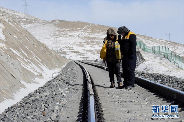 青藏鐵路格爾木工務段望昆線路養(yǎng)護車間副主任于本蕃(右)和工友一起檢查軌道平順度(1月11日攝)。 新華社發(fā)(王浡 攝)