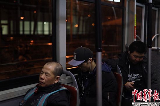 凌晨乘坐夜班車的年輕人沉浸在音樂里。?鄭萍萍攝