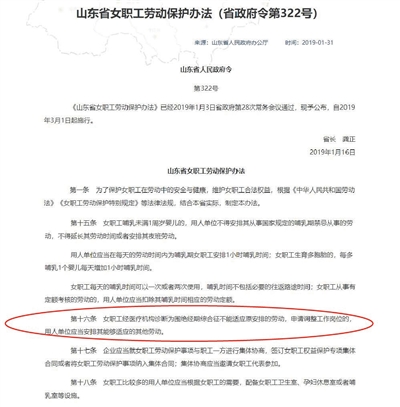 昨天,新京報記者從相關(guān)部門獲得的一份發(fā)布會文字資料顯示,為保護(hù)女職工在勞動中的安全與健康,維護(hù)女職工合法權(quán)益,制定了《辦法》《辦法》共26條,經(jīng)山東省政府第28次常務(wù)會議通過,2019年1月16日簽發(fā)公布,自2019年3月1日起施行。