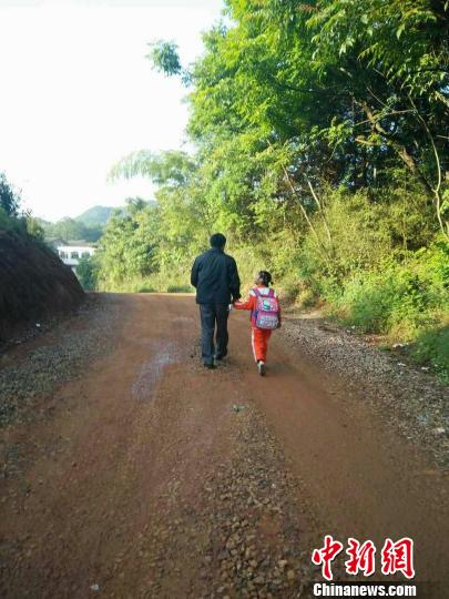 愛心志愿者康雄牽著“事實孤兒”去上學的背景?!¢L沙市岳麓區(qū)大愛無疆公益文化促進會供圖 攝