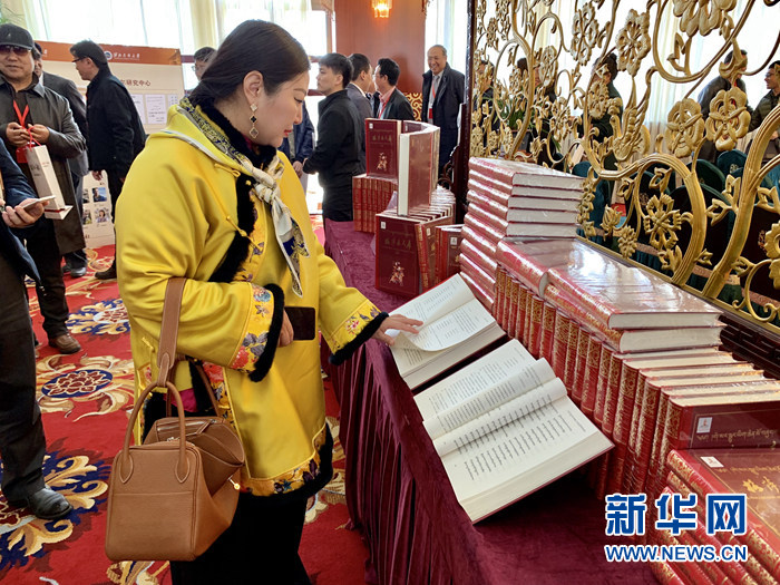 與會(huì)嘉賓在發(fā)布儀式現(xiàn)場翻閱《格薩爾文庫》。新華網(wǎng) 王頔 攝