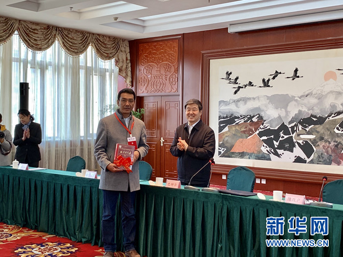全國政協(xié)副主席、國家民委主任巴特爾(右一)向相關(guān)單位贈(zèng)書。新華網(wǎng) 王頔 攝