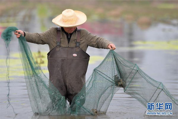 在湖南省南縣一處稻蝦蟹綜合種養(yǎng)基地,農(nóng)戶(hù)在捕收蝦蟹(3月13日攝)。新華社發(fā)(陳澤國(guó) 攝)