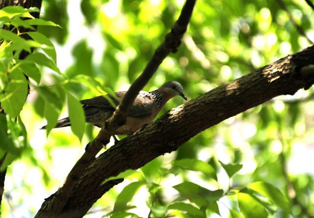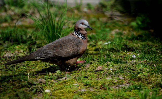 記者居住的小區(qū)里鳥也很多,陽臺(tái)下面一棵廣玉蘭樹上,一對(duì)珠頸斑鳩已經(jīng)安家了很多年。經(jīng)??匆姴弊由虾孟翊髦蝗φ渲轫?xiàng)鏈的珠頸斑鳩,結(jié)伴到小區(qū)草地上覓食,熟悉得好像小區(qū)里的老鄰居。