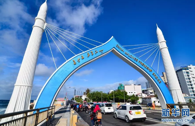 2018年10月2日,車輛從由中國援建、連接馬爾代夫首都馬累和機(jī)場島的中馬友誼大橋橋頭拱門穿過。新華社發(fā)(杜才良 攝)