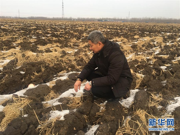孫斌在公司的農(nóng)田中查看秸稈還田情況(2月2日攝)。新華社記者 王君寶 攝