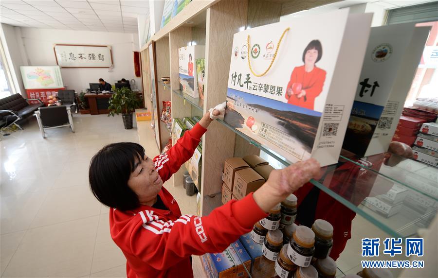 凡平在位于陜西宜川縣城自己公司的實體店里整理展示柜(2018年10月16日攝)。新華社記者 劉瀟 攝