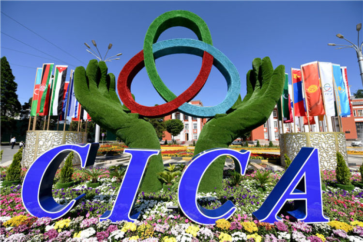 這是6月13日在塔吉克斯坦首都杜尚別拍攝的亞洲相互協(xié)作與信任措施會議標識。新華社記者 沙達提 攝