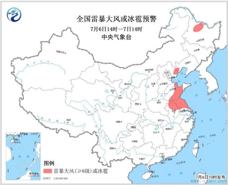 預(yù)計7月6日14時至7日14時,黑龍江北部、河北東北部、山東中部、安徽北部、江蘇中北部等地的部分地區(qū)將有8-10級雷暴大風或冰雹天氣,局地將出現(xiàn)極端雷暴大風,瞬時風力可達10級以上;黑龍江北部、遼寧西部、河北東部、北京東部、天津、山東中部、安徽東北部、江蘇中北部、云南西部和北部、貴州南部、湖南中南部、江西中部、浙江北部和南部、福建中北部、廣西北部以及廣東北部等地的部分地區(qū)將有短時強降水,小時雨量20-50毫米,局地可達70毫米以上。