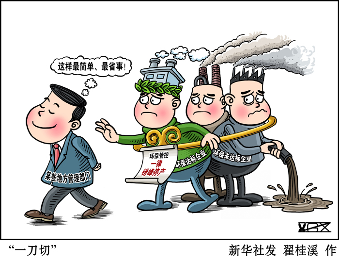 值得注意的是,有些地方“一刀切”政策開始搞移花接木。中部多家企業(yè)的相關負責人反映,遇到上級部門前來檢查、督查時,地方政府擔心指標不符合要求,就讓企業(yè)一律采取停產應對。可在對外發(fā)布消息時,卻說成“企業(yè)停產檢修”“企業(yè)升級改造設備”,本是地方的“一刀切”要求,卻搖身一變成為企業(yè)的“自行選擇”。
