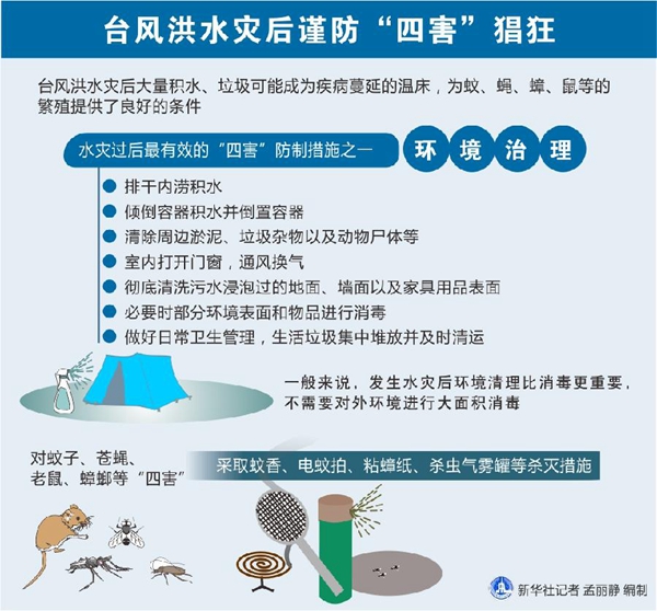 新華社杭州8月11日電(記者黃筱)臺風(fēng)洪水災(zāi)后大量積水、垃圾可能成為疾病蔓延的溫床,為蚊、蠅、蟑、鼠等的繁殖提供了良好的條件,稍不留神這些“四害”便會猖狂。杭州市疾控中心專家提醒受災(zāi)群眾需及時清理環(huán)境和消毒,預(yù)防疾病。