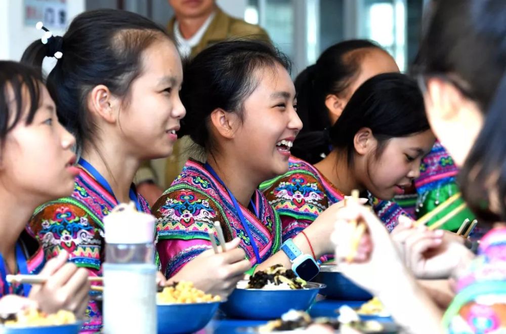 2017年11月1日,廣西融水苗族自治縣民族中學(xué)的學(xué)生們?cè)诔誀I(yíng)養(yǎng)餐。該縣共有5.6萬(wàn)名學(xué)生享受免費(fèi)營(yíng)養(yǎng)餐。(新華社記者黃孝邦 攝)