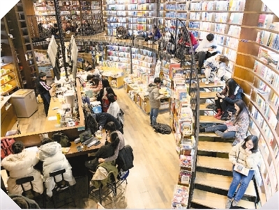 放眼望去,燈火通明的書店在深夜里依然座無虛席。有人緩緩踱步,不時(shí)翻翻看看;有人啜著咖啡,面對(duì)電腦手指翻飛。記者沿著樓梯拾級(jí)而上,發(fā)現(xiàn)還有一些顧客或坐或臥,或淺聲交談,或?qū)P拈喿x。