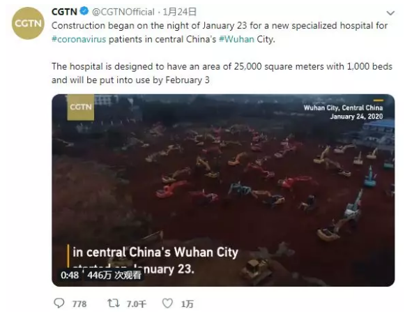 昨晚,CGTN在推特發(fā)布的一條關(guān)于武漢火神山醫(yī)院工地施工現(xiàn)場(chǎng)的視頻一舉沖上該平臺(tái)國(guó)際新聞首頁(yè)熱門(mén),觀看量超446萬(wàn),超過(guò)153萬(wàn)的全球網(wǎng)友參與互動(dòng)。
