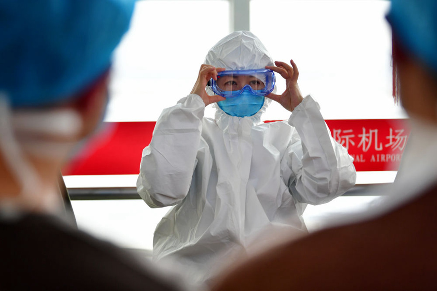 1月28日,甘肅中醫(yī)藥大學(xué)附屬醫(yī)院重癥醫(yī)學(xué)科護(hù)士長(zhǎng)徐小艷(中)在出發(fā)前為同伴演示防護(hù)裝備穿戴。新華社記者 陳斌 攝