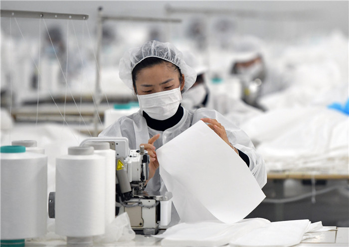 1月28日,在武漢市新洲區(qū)武漢協(xié)卓衛(wèi)生用品有限公司,工人在趕制防護(hù)服,該公司是生產(chǎn)手術(shù)服、防護(hù)服等產(chǎn)品的企業(yè)。 新華社記者 才揚 攝