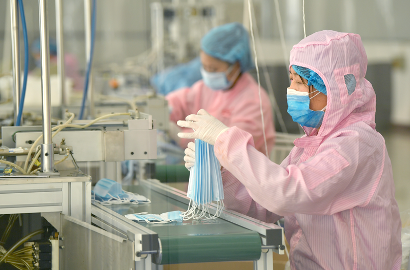 為助力抗擊新型冠狀病毒感染的肺炎疫情,陜西省西安市10家生產(chǎn)防護(hù)消毒用品的單位已緊急召回、招聘員工,滿負(fù)荷生產(chǎn),以保障口罩、消毒液等防護(hù)消毒用品的穩(wěn)定供給。圖為1月29日,西安市鄠邑區(qū)一公司員工在制作口罩。