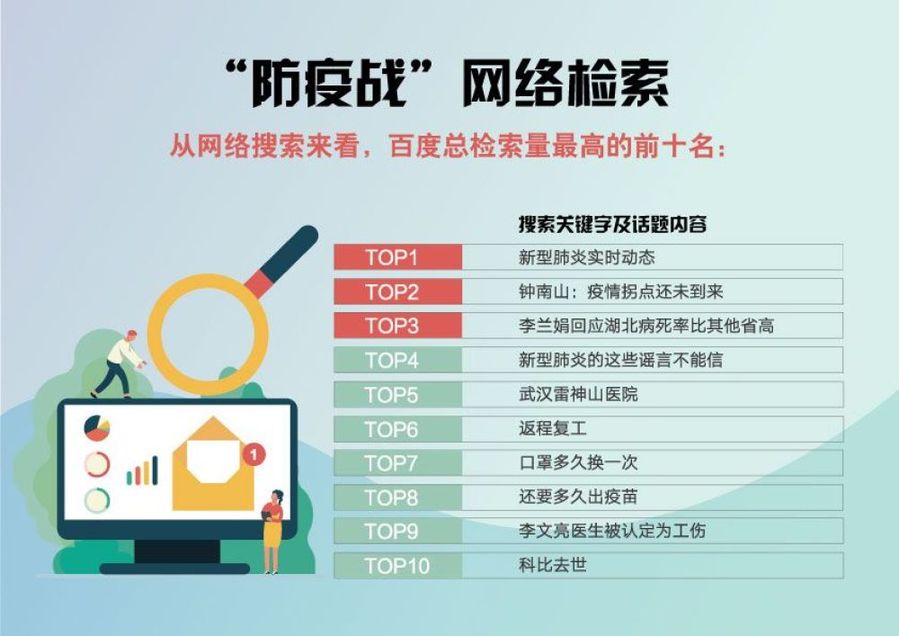 在百度搜索平臺,日均超過10億人次搜索與“新冠肺炎”疫情有關(guān)的消息。“鐘爺爺”、“李奶奶”的發(fā)言最受關(guān)注,排名熱搜前列。