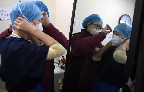 武漢協(xié)和醫(yī)院(西院),湘雅醫(yī)院感染病科醫(yī)生在穿防護(hù)衣。經(jīng)濟(jì)日報(bào)記者高興貴攝
