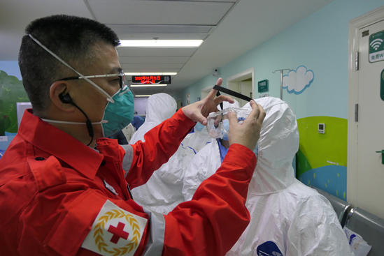 陳爾真幫助檢查隊(duì)員上班前穿戴隔離裝備 (拍攝者:隊(duì)員施偉雄)