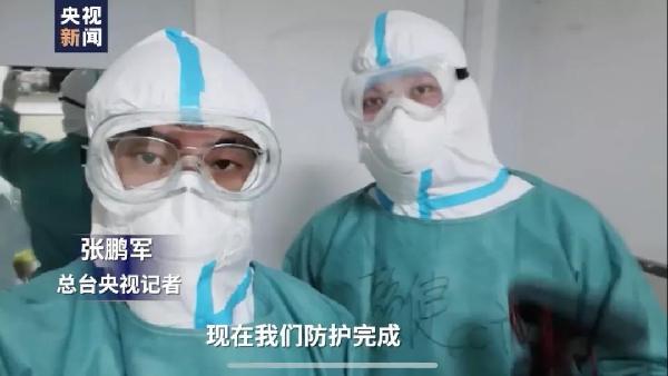 中央廣播電視總臺記者張鵬軍、賴健進入武漢市漢口醫(yī)院隔離區(qū)采訪。