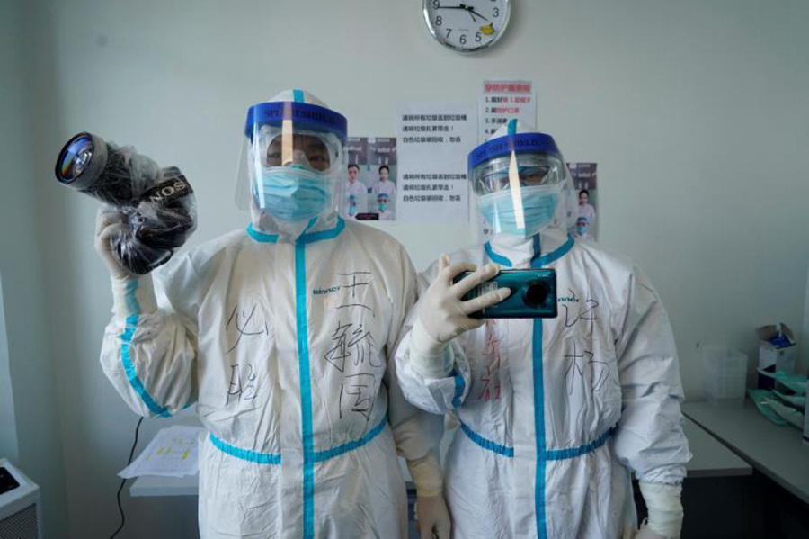 2月18日,新華社記者王毓國(左)、許楊在華中科技大學同濟醫(yī)院中法新城院區(qū)準備進入隔離病房內(nèi)采訪。新華社記者 余國慶 攝
