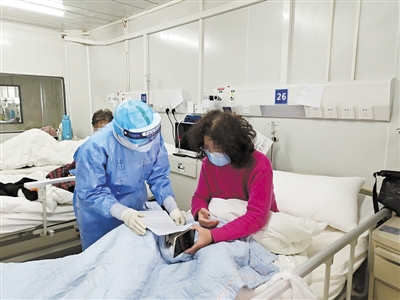 按照“紅區(qū)”病房的要求,非醫(yī)務(wù)人員不得進入,黃舒和隊友需身兼數(shù)職,除了做日常治療和護理外,她還要負責(zé)打掃衛(wèi)生、病區(qū)消毒、照顧患者飲食起居等工作?!凹t區(qū)”老年病人占據(jù)大比例,由于病人病情較重,黃舒和戰(zhàn)友需要幫他們喂飯喂水、接大小便、洗漱洗手等,工作量和辛苦程度可想而知。