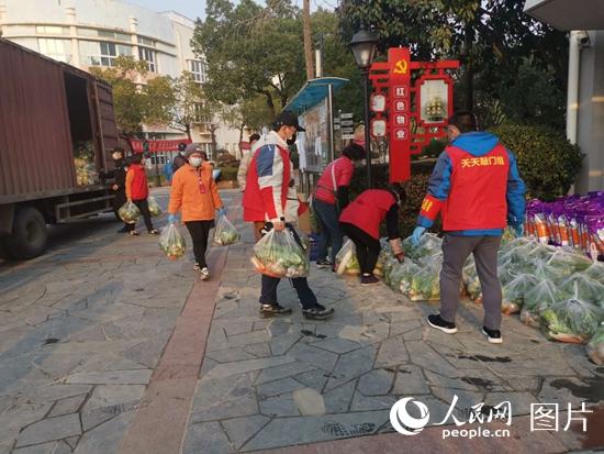 志愿者鄧偉龍在綠景苑社區(qū)搬運蔬菜。人民網(wǎng)湖北頻道金雨蒙 攝