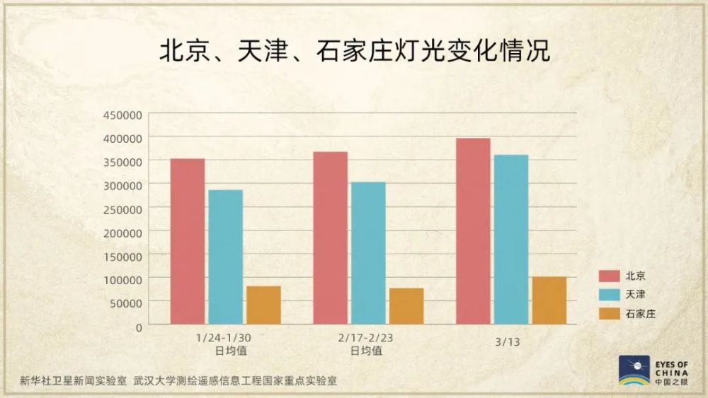 這是春節(jié)期間至3月13日,京津冀地區(qū)夜間燈光亮度變化情況,2月下旬起亮度出現(xiàn)提升。