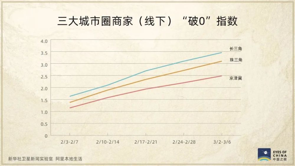 “破0”指數(shù),是根據(jù)商家恢復(fù)營(yíng)業(yè)獲得首筆收入、復(fù)工后的持續(xù)營(yíng)業(yè)時(shí)間等計(jì)算得出,這兩張圖呈現(xiàn)出,在三大城市圈,復(fù)工復(fù)產(chǎn)并獲得收入的商家不斷增多。