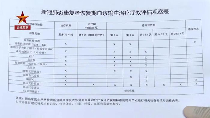 為了對療效進行評估,患者在輸注恢復期血漿后,醫(yī)護人員還會按照《療效評估觀察表》嚴密監(jiān)測相關指標,包括一般生命體征、氧合改善情況、病毒抗體等,并及時記錄。