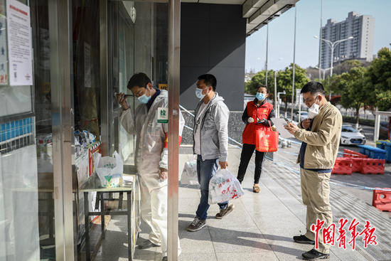 3月19日,湖北省武漢市一家藥店,幾名志愿者在幫忙買藥。中青報(bào)·中青網(wǎng)記者 趙迪/攝