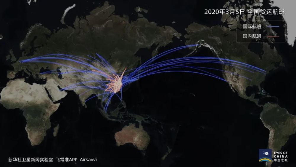 1個月內(nèi),中國國內(nèi)和直飛世界各地的貨運(yùn)航班快速增多,原有航線航班數(shù)也有增加,標(biāo)示航線的橘色、藍(lán)色線條也就更粗。